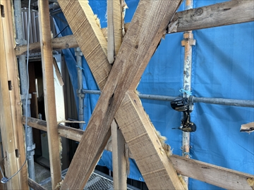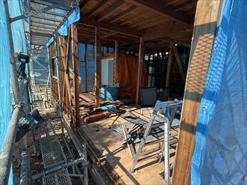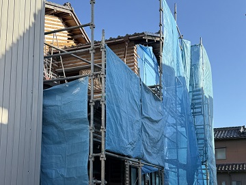 足場が組立てられ外壁と屋根瓦の解体が始まりました