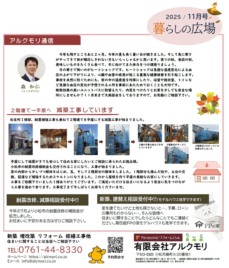 2025年10月27日 暮らしの広場 2025年11月号 小松市で減築&耐震改修工事中 2階建てを減築して平屋に PanasonicリフォームClub 石川県合同開催 秋の相談会 in パナソニック ショウルーム金沢 画像クリックで拡大します