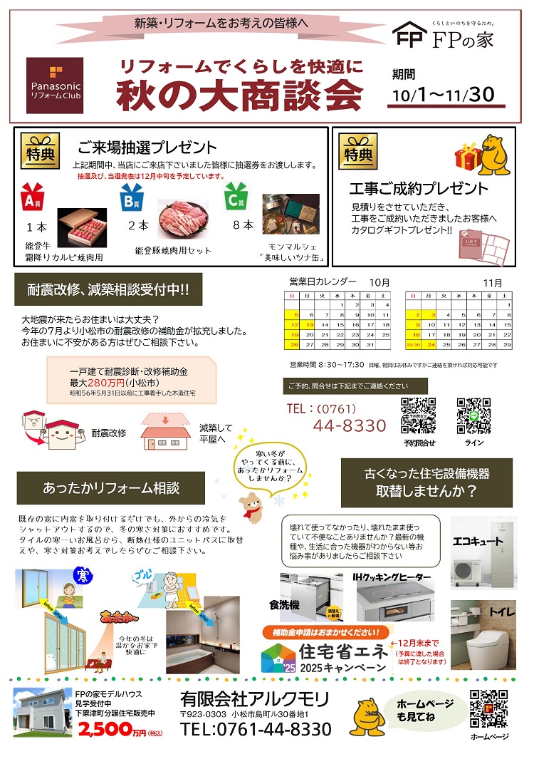 2025年09月22日 参加募集中秋の大商談会2025 PanasonicリフォームClub 開催中~11/30 日時 ~11月30日まで開催中 場所 アルクモリ LINEからもお気軽にお問合せ下さい @iod1863o友達登録はこちら